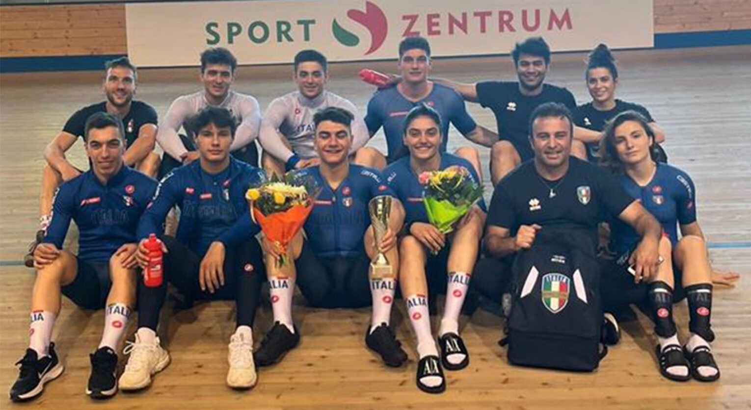 Mentre a Milton si svolgeva la seconda tappa di Nations Cup, Ivan Quaranta ha portato i suoi ragazzi del settore velocità a Francoforte, alla Brandenburger Sprint Cup. La notizia è nel fatto che la truppa azzurra ha portato a casa una serie clamorosa di risultati di spicco, dalla doppietta di successi di Mattia Predomo fra gli juniores (con gli ori in velocità e keirin, con Marco Morgante al 3° posto), al record italiano assoluto della velocità a squadre, dove Matteo Bianchi, Mattia Tugnolo e Daniele Napolitano hanno fatto fermare i cronometri sul tempo di 44”785 togliendo oltre un secondo al vecchio record.