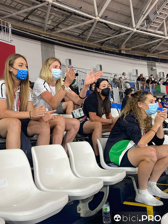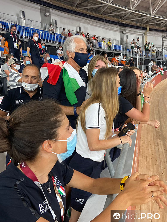 A sostenere gli azzurri, con bandiere e divisa ufficiale ci sono le ragazze del quartetto. Con bandiere al collo e dita in bocca per la tensione. E c’è anche Cordiano Dagnoni, il presidente della Federazione ciclistica italiana.
