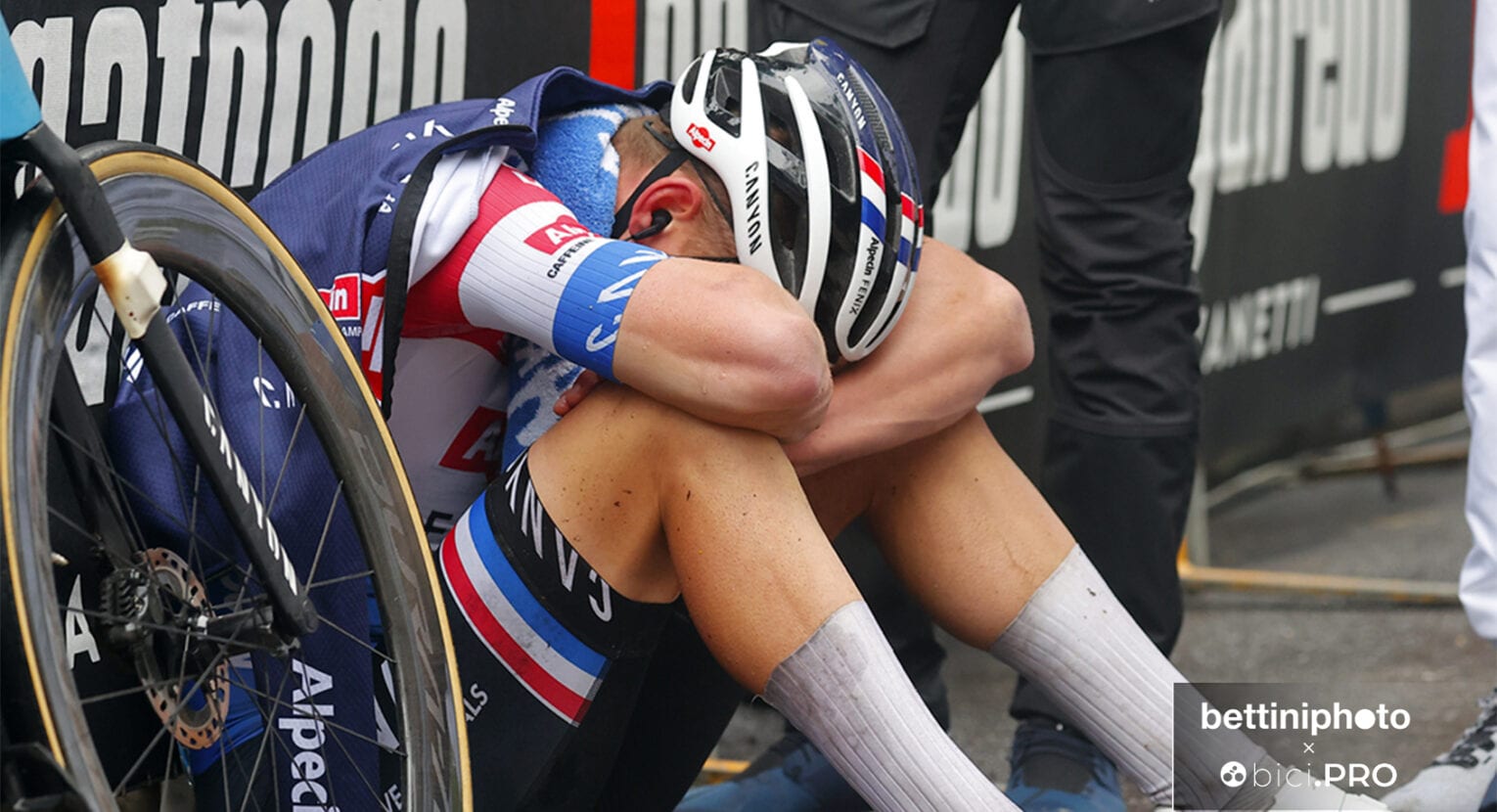 Van der Poel ha tagliato il traguardo. Si è avvicinato ai suoi uomini. Ha provato a sollevare la gamba per scavalcare le sella ed è franato sotto la bici. E’ rimasto disteso per qualche secondo poi si è seduto contro la transenna. Se a Siena il suo guardare gli altri con una Coca in mano era parso quasi un gesto da cowboy, questa volta neanche uno sguardo di fiamma.
