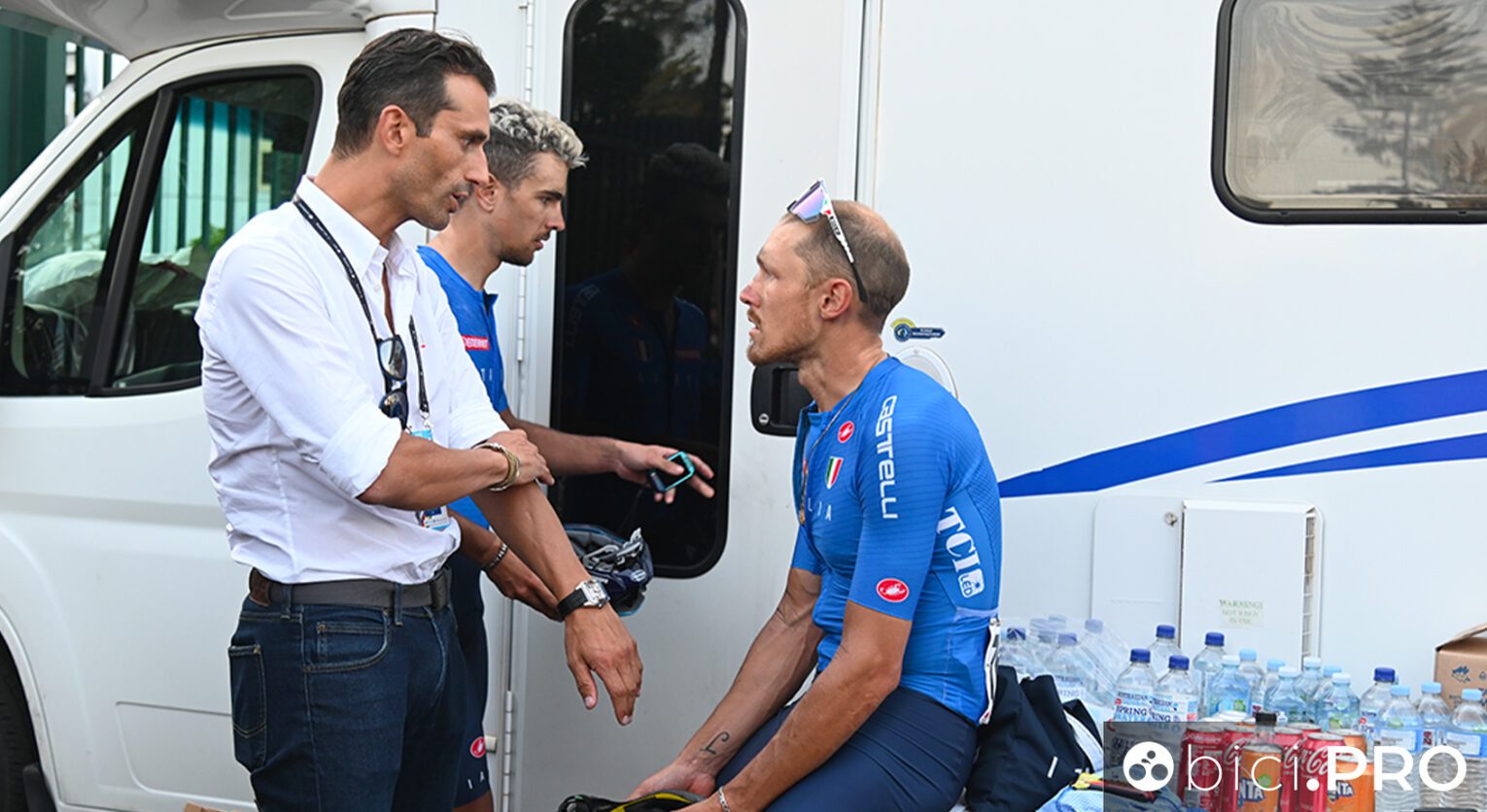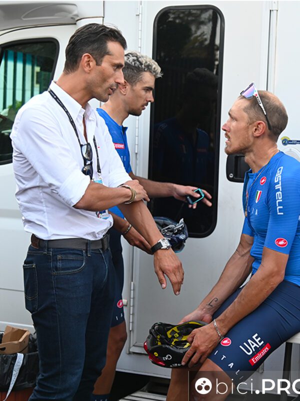 C’è quell’unica sbavatura che ci gira per la testa ed è il fatto che nessuno dei leader abbia seguito l’azione di Evenepoel e nella fuga siano rimasti soltanto Lorenzo Rota e Nicola Conci. Appena siamo arrivati al camper della nazionale, abbiamo trovato Bennati e Trentin che parlavano proprio di questo (foto di apertura). Matteo non sembrava molto convinto, ma non doveva essere lui a muoversi. Bennati allarga le braccia, la mancanza l’ha colta pure lui.