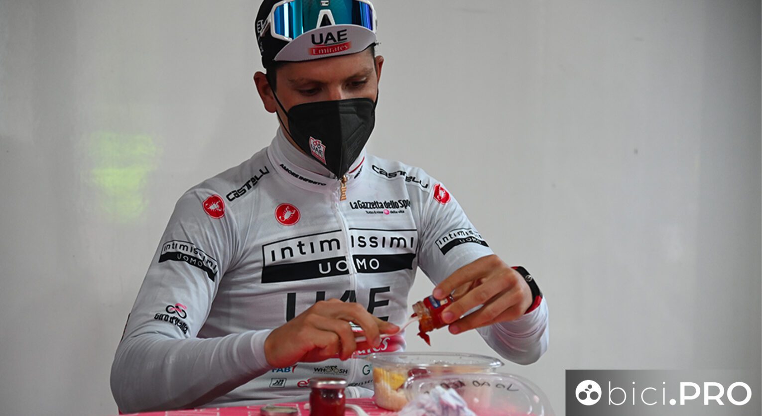 MONTE BONDONE – Mentre Thomas finisce di parlare, Almeida si siede, poggia sul tavolo una ciotola di riso e uova e inizia a vuotarci dentro due vasetti di ketchup. Se ne sta lì a mescolare con gli occhi famelici e con gesti metodici e attenti. Perciò supponiamo che rimanga anche male quando la nuova maglia rosa si alza e lo chiamano al microfono per raccontare la sua vittoria. Però non si scompone, continua a mescolare e intanto ascolta. Poi si ferma. E risponde.