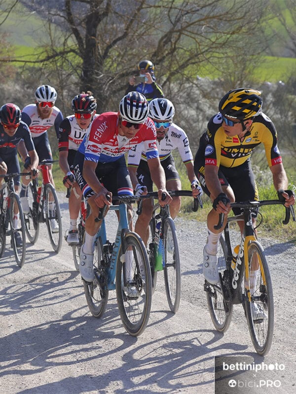 «Questa Strade Bianche è stata una gran bella corsa – riprende – Una competizione in cui non puoi bluffare. Mi aspettavo una sfida tra loro due anche nel finale. Il fatto che Van der Poel abbia fatto quel numero non mi ha stupito. Lui esce dall’inverno del ciclocross. Ha una capacità di resistere all’acido lattico superiore. Era più avanti con la condizione. E’ vero che dopo il cross un po’ si è fermato, ma non è che abbia perso molto. Anzi, ha fatto della supercompensazione».