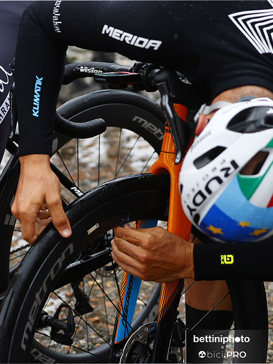 Pochi minuti alla partenza: Colbrelli controlla la pressione delle gomme