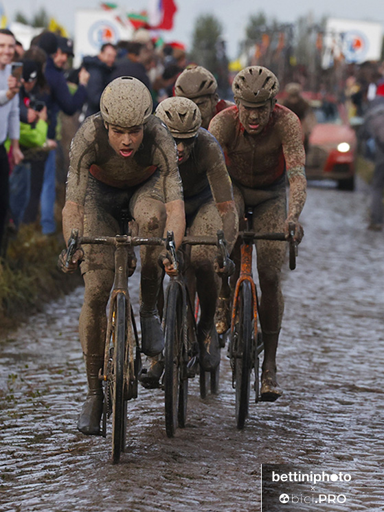 Pioggia e fango hanno trasformato i corridori in statue di terra. I tre di testa entrano nel velodromo con maschere di fango e gli occhi riparati provvidenzialmente dai grossi occhiali. Colbrelli è guardingo, la tensione è alle stelle. E’ stato lui ad accelerare secco quando Van der Poel ha riagganciato Moscon, anche per capire quanta birra avesse l’olandese. Una volata in pista dopo 260 chilometri fatti a quel modo più che una lotteria è una guerra per la sopravvivenza e così si apprestano a viverla. Vermeersch che non sanno chi sia, ma nell’avvicinamento al velodromo ha provato ad attaccare.