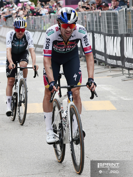 In un certo momento si è pensato che il Giro della Red Bull-BORA-hansgrohe si fosse sgretolato nelle fragilità di Roglic e della sfortuna di Hindley. Quando i due capitani designati si sono ritirati è cambiato tutto nella testa di chi era rimasto. Il primo a dare un segnale di questo tipo è stato il giovane Pellizzari, nella stessa tappa in cui Roglic ha alzato bandiera bianca. L’attacco del marchigiano sulla salita di San Valentino ha acceso gli animi dei tifosi ma per una formazione che vuole vincere e ha investito per farlo non basta un terzo posto anche se ambizioso e sorride al futuro.