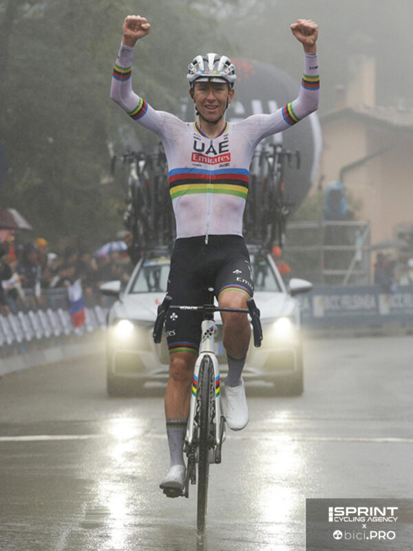 «Qualsiasi maglia indossi – spiega Gianetti – Tadej va forte. Per lui è un momento magico. E’ andato in progressione da inizio stagione. E’ partito bene, poi al Giro ha alzato il livello e al Tour ha fatto un ulteriore passo in avanti. Dopo di che ha recuperato, si è messo sotto a lavorare con l’idea del campionato del mondo. Ed è riuscito a migliorare ancora qualcosina. Oggi non era in programma un attacco, ma le condizioni meteorologiche hanno fatto la loro parte. Ha seguito Evenepoel nel suo allungo, poi ha visto che erano tutti in difficoltà e che non riuscivano a mantenere il suo ritmo. Finirà con Tre Valli e Lombardia. Lui vuole sempre vincere, però è normale che non può fare il numero ogni volta. Le prossime sono gare diverse dall’Emilia, quindi vedremo come saranno. Oggi all’Emilia ci teneva molto perché negli ultimi due anni era arrivato secondo. E vincere con la maglia iridata è bellissimo anche per noi».