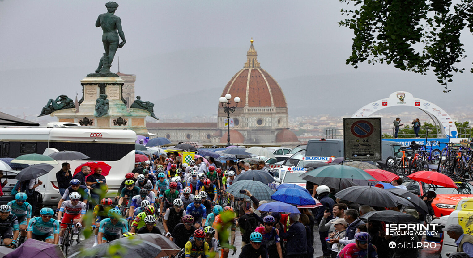 Il via è stato dato con un quarto d’ora di ritardo, perché si aspettava Eugenio Giani, il Governatore della Toscana. Non si sa se perché a Firenze fosse giorno di elezioni comunali o se per motivazioni personali, sta di fatto che Giani non c’era e i corridori hanno atteso sotto la pioggia che arrivasse.