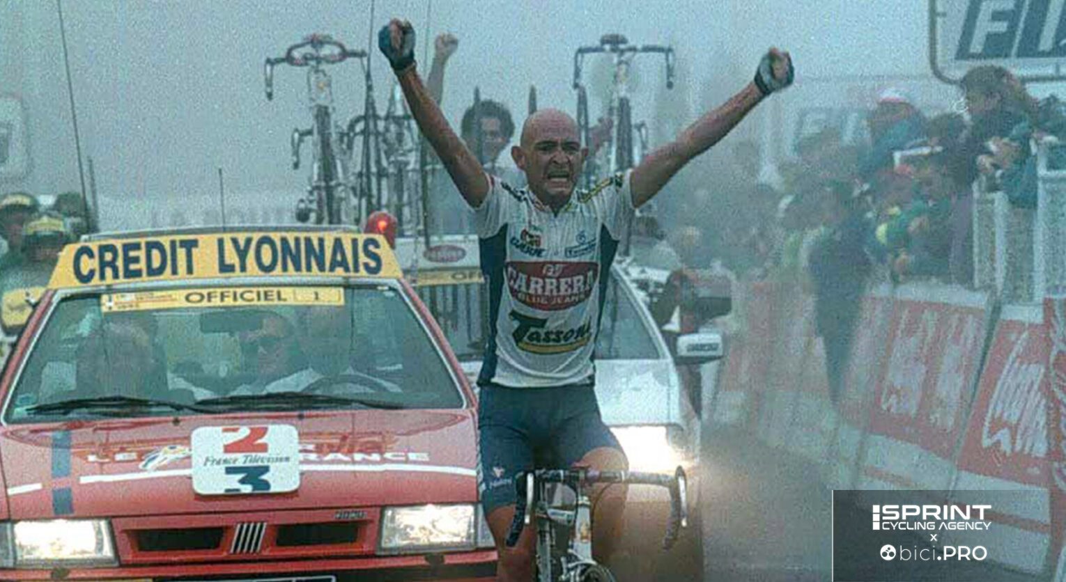 Una volta sulla cima di Guzet Neige, nel lontano Tour del 1995 (foto di apertura), chiedemmo a Marco Pantani se non trovasse strano correre e vincere così all’antica, con quegli attacchi da lontano che sembravano giungere da un ciclismo precedente. E Marco, cui certo non mancava una visione di ciò che avrebbe potuto rendere spettacolare questo sport, rispose in modo chiaro.