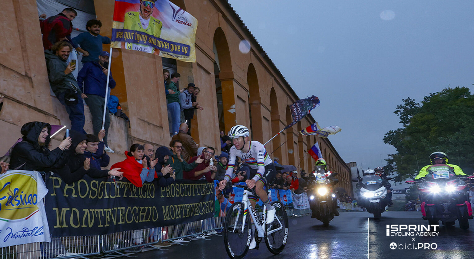 «Immaginate di essere Evenepoel, Roglic, Pidcock. Siete alla partenza del Giro dell’Emilia e guardando verso destra, sulla linea di partenza, vedete questo personaggio qui fresco reduce da un mondiale dominato dopo la doppia corona Giro-Tour. A quel punto le alternative sono due: sperare in una sua foratura a 500 m dall’arrivo (500 m non prima se no fa in tempo a rientrare e vincere). Mandare tutti a quel paese, imprecando perché lui sia anche qui, ed entrare nella classica osteriaccia bolognese e finire la stagione a tagliatelle col ragù e sangiovese. Qualsiasi decisione uno prenda…lui vincerà lo stesso!!».