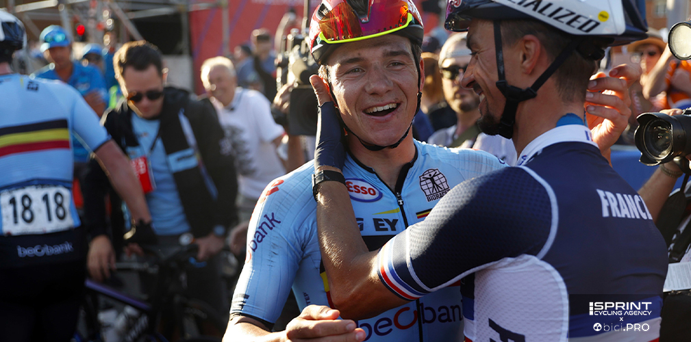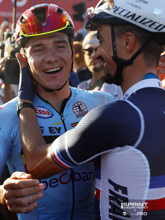 Remco Evenepoel arriva davanti ai giornalisti dopo aver abbracciato e ricevuto abbracci. Bello quello con Van Aert dopo l’arrivo e bello anche quello con Alaphilippe, suo fratello maggiore alla Quick Step-Alpha Vinyl. La gente ai piedi del palco lo ha osannato, perché quel suo vincere sfrontato ha conquistato la gente accalcata nel parco in riva al mare.