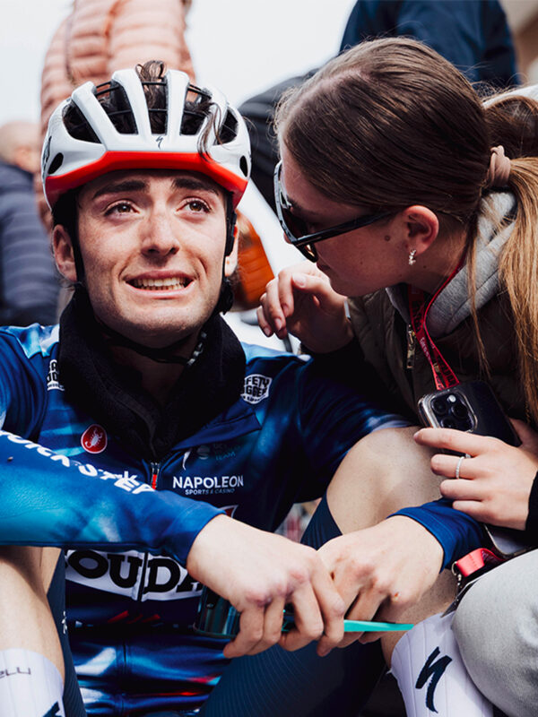 Gli diamo il tempo per riprendere fiato e riconnettere i pensieri. Fissa un punto davanti, il sudore gli imperla il viso. Quando ci avviciniamo, ci guarda e il sorriso è un po’ amaro e un po’ stupito per quello che ha fatto. Tutto intorno, nulla accenna a placarsi. Gente che spinge, che va e che viene. A un certo punto al giovane marchigiano della Soudal-Quick Step di avvicina James Knox, arrivato a 1’59”. Gli poggia una mano sulla nuca, gli fa i complimenti e gli chiede come si senta. Lui farfuglia qualcosa e l’altro si allontana.