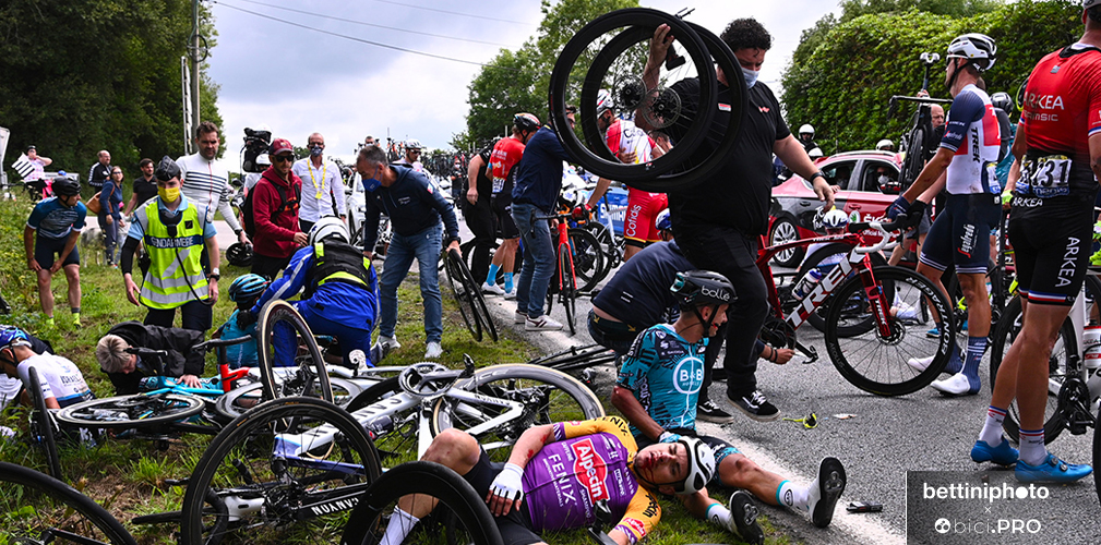 Negli occhi abbiamo ancora tutto quello che è successo nelle prime tre frazioni del Tour de France: dalla incauta pseudo-tifosa col cartello a favore di telecamere della prima tappa alle cadute in successione negli ultimissimi chilometri della terza. E al recente Giro d’Italia abbiamo assistito a circostanze simili: la rovinosa caduta nella tappa di Cattolica, tamponamenti violenti tra ammiraglie o addirittura tra ammiraglie e corridore (quella subita da Pieter Serry della Deceuninck-Quick Step dall’auto del Team Bike Exchange durante l’ascesa finale della sesta tappa).