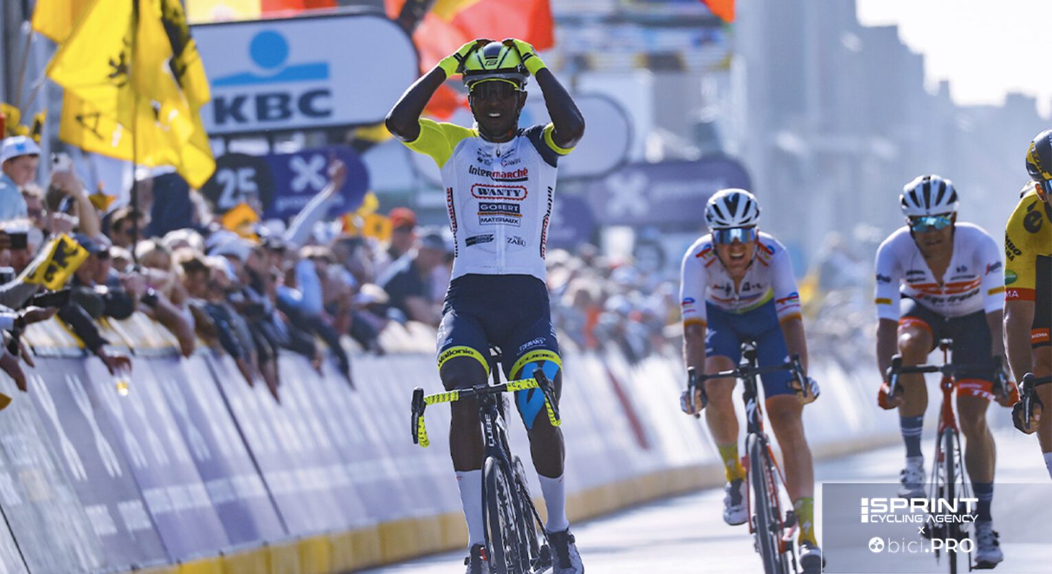 Lì Girmay è un gatto. Resta in quarta ruota, non si muove. Segue gli zig-zag del gruppo. La fuoriuscita di Kragh Andersen costringe i quattro a non calare troppo il ritmo. Ai 200 metri, con un rapporto piuttosto agile, l’eritreo scarta e scatta. Esce dal trenino, si sposta alle transenne e vola via. Prende cinque metri che non saranno più chiusi. La Gand-Wevelgem numero 84 è sua.