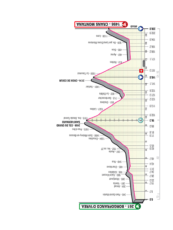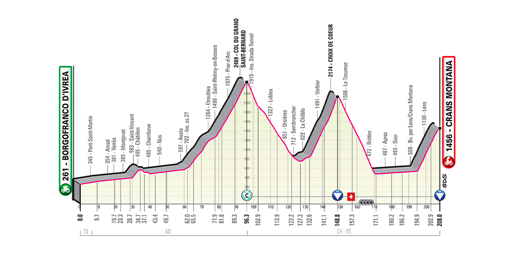 La prima tappa alpina sarà la numero 13 con arrivo a Crans Montana in Svizzera, per l’unico sconfinamento del Giro 2023. Affronterà il Gran San Bernardo (2.469 metri – Cima Coppi, per la quarta volta all’estero) e la Croix de Coeur. Il tempo di un passaggio per velocisti a Cassano Magnago, paese di Ivan Basso e del compianto Panizza, e della nervosa tappa di Bergamo e poi il secondo riposo permetterà di caricare le batterie in vista della terza settimana, in cui si vedranno le streghe.