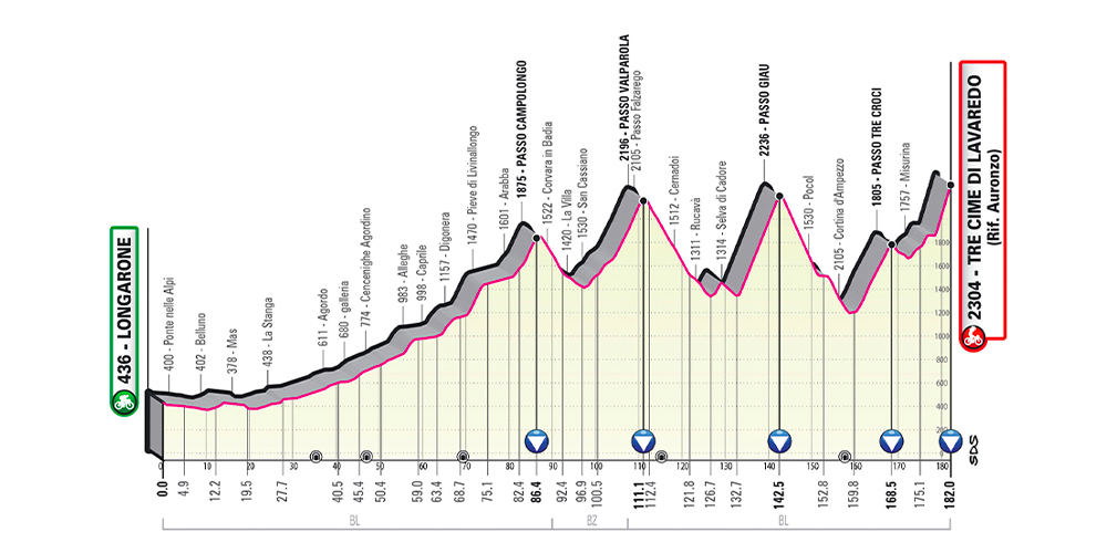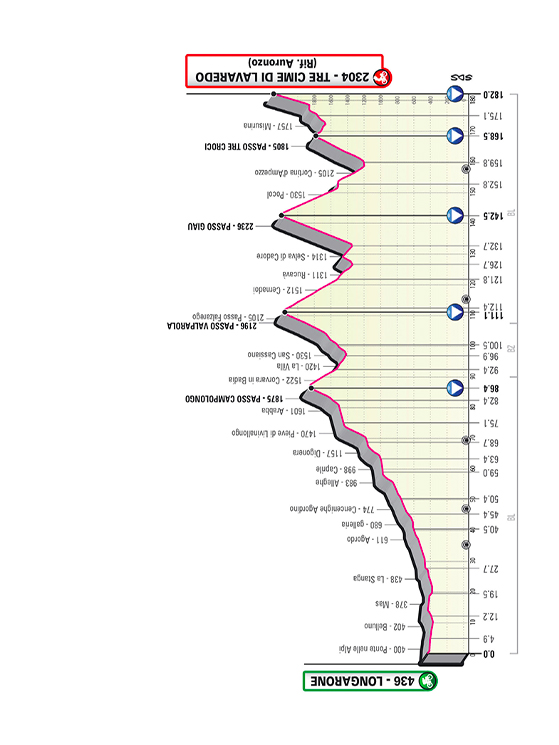 La tappa di Val di Zoldo prevede infatti 3.700 metri di dislivello: breve, se si possono ritenere pochi 160 chilometri di montagna. E l’indomani, 19 maggio, andrà in scena il vero tappone dolomitico, da Longarone alle Tre Cime di Lavaredo (182 chilometri e 5.400 metri di dislivello), con il Campolongo, il Valparola, il Giau (versante Selva di Cadore), Passo Tre Croci e Tre Cime di Lavaredo con le pendenze fino al 18 per cento. E solo a quel punto, se qualcuno ha salvato gambe e attitudine per la crono, potrà tentare di fare la differenza in quei 18,6 chilometri da Tarvisio al Monte Lussari, con il finale su una salita di 7,5 chilometri e pendenze attorno al 12 per cento medio con i primi 4,8 al 15 per cento.
