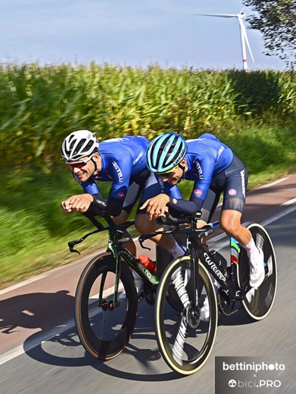 Gli azzurri per le sfide contro il tempo sono volati in Belgio mercoledì, con Villa e Velo. L’hotel sul Mare del Nord vicino alla partenza da Knokke-Heist e ieri la possibilità di provare il percorso con le strade chiuse (in apertura, Pippo con Sobrero). Un gran piattone, terreno di caccia per specialisti. Solo che le strade chiuse per provare hanno così sconvolto la circolazione, che quando all’arrivo gli under 23 hanno chiesto di riprovarlo, per Villa c’è stato da mettersi le mani nei capelli.