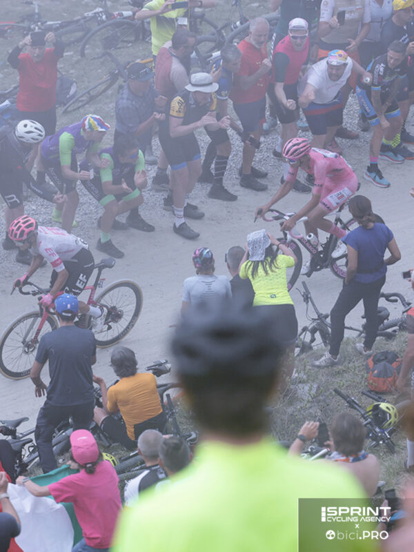 «Verso fine scalata del Finestre abbiamo deciso così e gli ultimi tre chilometri di salita abbiamo fatto un’andatura per non fare rientrare i compagni di Del Toro, pensando che poi Isaac avrebbe tirato da solo nella valle. Però anche loro alla fine hanno deciso di aspettare. Dietro stavano rinvenendo Majka e McNulty e anche un terzo compagno, però era difficile capire i distacchi da loro. Noi li abbiamo passati in salita con l’ammiraglia e sapevamo che erano abbastanza lontani, anche un paio di minuti. Con Van Aert davanti non puoi avere dubbi e aspettare altri due minuti per cercare di chiuderne quattro. Noi a quel punto non potevamo fare altro che stare a ruota e lasciare la responsabilità a loro».
