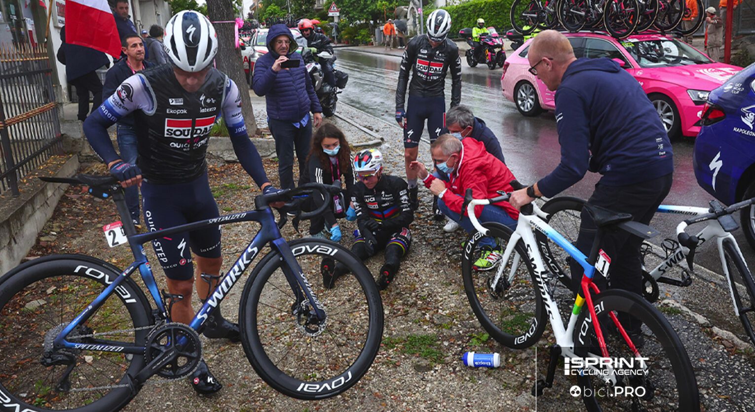 La scivolata l’ha provocata una spallata contro Kirsch della Trek-Segafredo, che nei momenti successi all’arrivo è andato a spiegarsi con Remco, anche se la colpa probabilmente non è stata sua, ma del belga. Avuta la certezza di esser nel tratto neutralizzato, il campione del mondo infatti si è voltato verso sinistra deviando la linea sulla destra e per questo toccando il lussemburghese.
