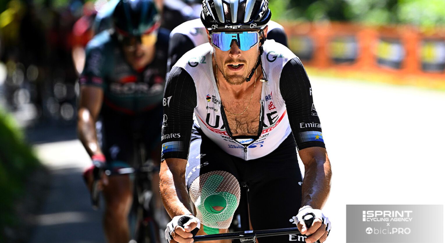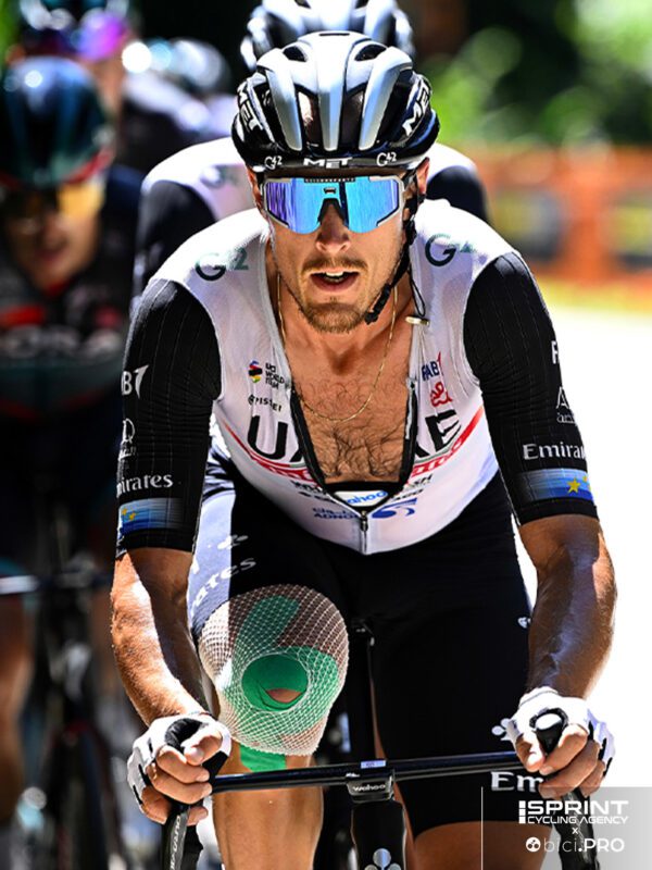 Sul ginocchio destro porta un bendaggio, la fisionomia è quella tipica del Tour de France che ti asciuga anche se non ne hai voglia. In questi giorni il lavoro di Trentin è chiaro: tirare in pianura e fino alle prime rampe delle salite, poi farsi da parte. In un modo o nell’altro, anche un buon percorso di preparazione.