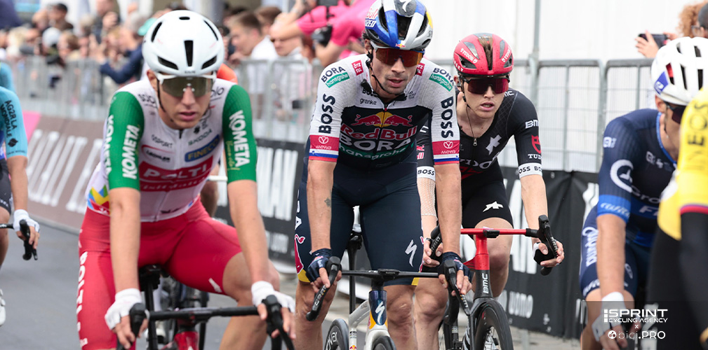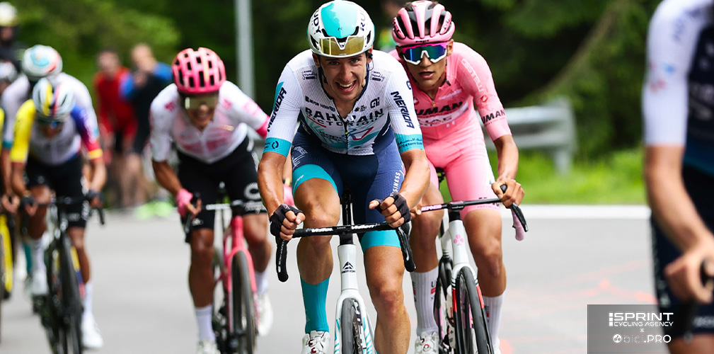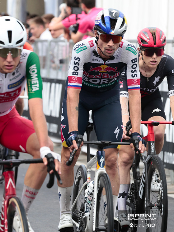 Tiberi, che ieri ha innescato la caduta sul pavé di Gorizia, ha risposto bene alle accelerazioni, avendo accanto un Damiano Caruso che, a dispetto degli anni, mostra ogni giorno di più il fondo e l’autorità per rispondere in prima persona agli attacchi dei campioni.