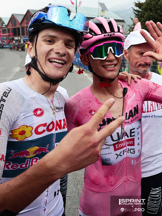 Lo abbiamo già detto: al Giro non doveva neppure esserci. Poi dalle parole del coach Artuso abbiamo scoperto che le sue prestazioni erano parse già così buone al Catalunya da aver persuaso la squadra a valutare l’opzione rosa. Felice come un bimbo, Giulio si era perciò presentato al via da Tirana, orgoglioso e motivato dall’idea di aiutare Roglic. Quando poi lo sloveno è caduto e si è fermato, la squadra ha dovuto resettare le impostazioni di partenza e lui ha raccolto con motivazione lo scettro di Primoz. Il bello, il segno del riconoscimento da parte dei compagni è stato nel loro votarsi alla causa. Anche Martinez, secondo nel 2024, e come lui Aleotti, che dopo quel Giro andò a vincere il Giro di Slovenia. Pellizzari capitano non è parsa un’idea balorda. E lui, stringendo i denti, in cinque tappe si è arrampicato dal diciottesimo al sesto posto generale.