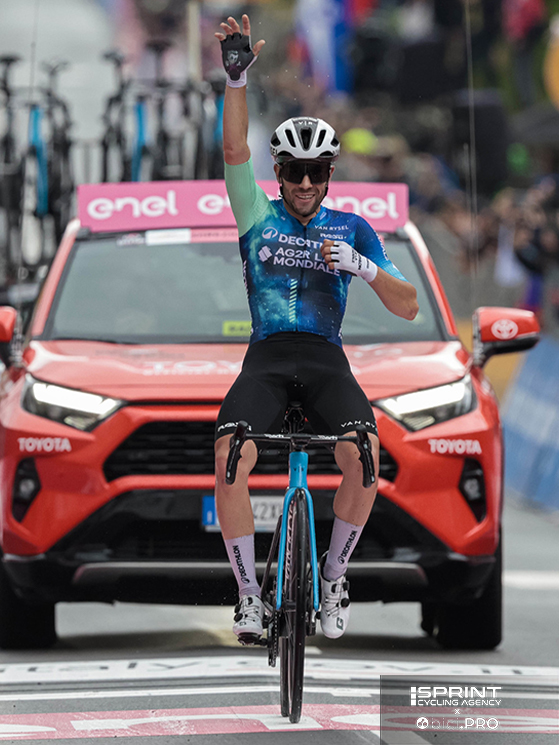 Il mio rapporto col percorso è sempre uguale. Preferisco studiarlo a fondo qualche giorno prima della partenza, dopodiché vivo tappa dopo tappa. Anche perché in un Giro di 21 tappe, la condizione può cambiare. Magari capita il giorno che il tuo fisico risponde bene e dei giorni che risponde male. Preferisco vivere alla giornata. L’anno scorso mi ero prefissato la tappa di Rapolano Terme vinta da Pelayo Sanchez su Alaphilippe. Ero in fuga anche io, però ho iniziato a stare male e alla fine non ho ottenuto nessun risultato. Ne avevo prevista un’altra, però stavo combattendo con una bronchite e anche quella è sfumata. E alla fine ho puntato tutto sull’ultima tappa disponibile, che era Sappada, la quarta che avevo cerchiato. Quindi è bello studiare tutti i giorni, ma stando attenti a non lasciarsi influenzare dalla condizione del momento.