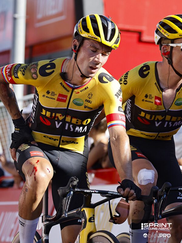 Non restava che la volata per dare una dimensione al vantaggio, quando Roglic si è toccato con Wright ed è caduto rovinosamente a terra. Escoriazioni, sangue e lo sguardo stordito.