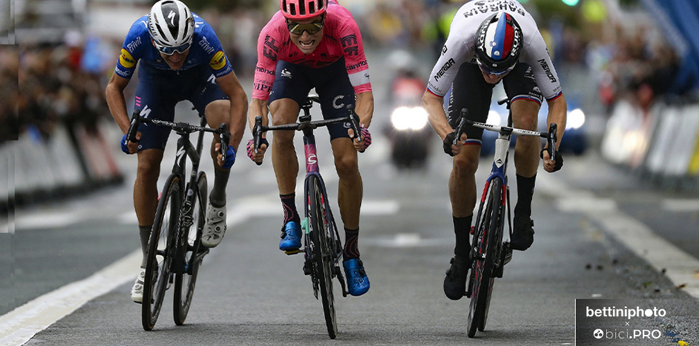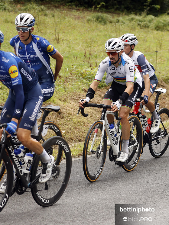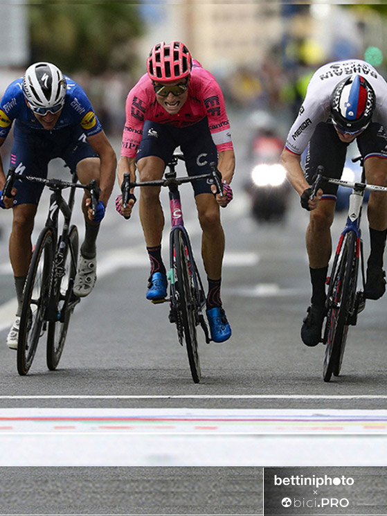 «L’ordine era di non aspettare l’ultima salita perché bisogna essere realisti: un Alaphilippe ti stacca al 100%, poi tutto può succedere ma di base è così. Ho visto dei movimenti nella penultima salita e ho attaccato anche io. E siamo andati via di forza, credetemi l’avevamo fatta a tutta. Ce la siamo guadagnata a colpi di pedale. E lo dimostra il fatto che abbiamo continuato a guadagnare anche dopo la salita.