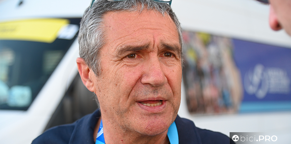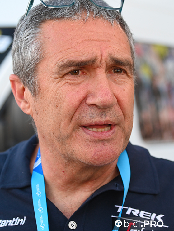 Adriano Baffi parla con motivato orgoglio, mentre Simmons dal palco saluta e alle spalle del tecnico della Trek-Segafredo Cataldo, Vacek e Aberasturi ripassano la tattica messa perfettamente in atto.