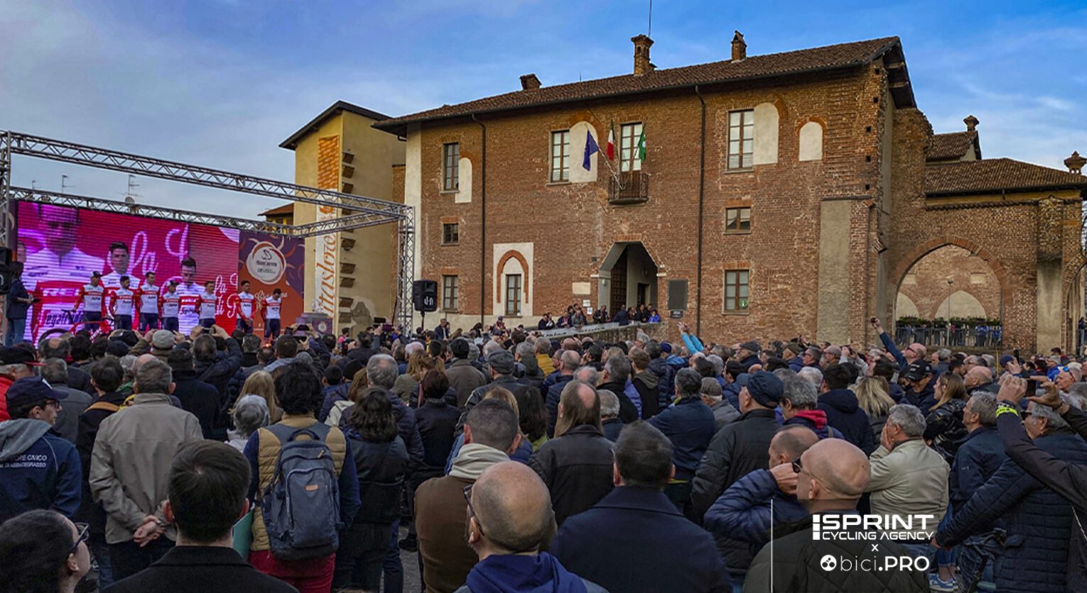 Abbiategrasso accoglie la Sanremo con un pubblico interessato e moderatamente chiassoso. Lo spostamento della partenza ha portato con sé anche quello di tutte le operazioni preliminari, cui si è aggiunta la presentazione delle squadre nella piazza del Castello Visconteo. Il paese è ormai una città, ma nel cuore ha un gioiello che per molti rappresenta una novità.