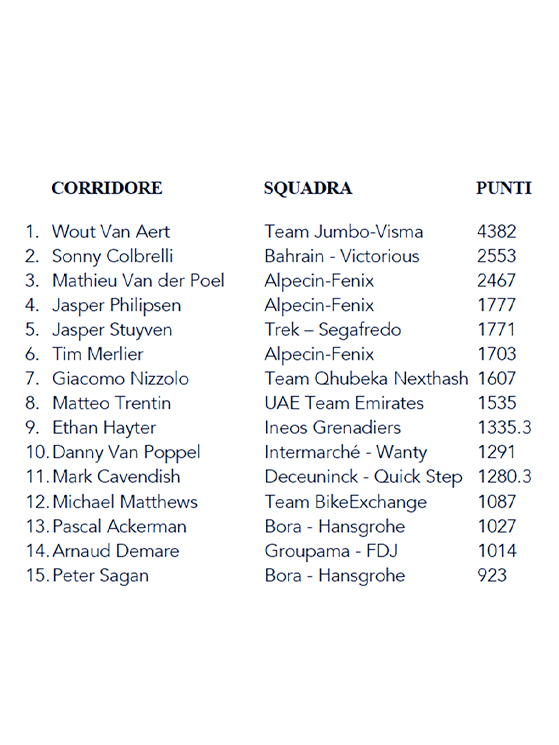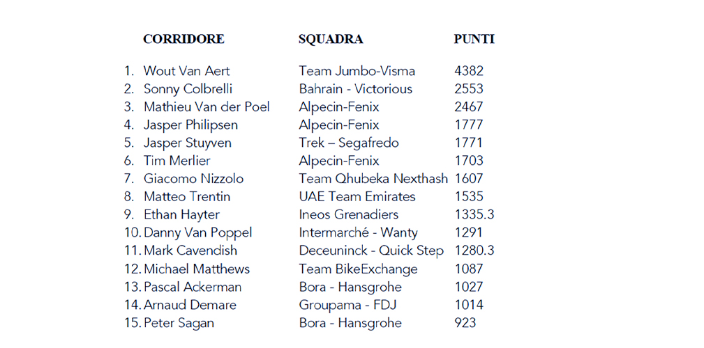 Nella tabella sopra abbiamo elencato i migliori 15 velocisti, quelli con più punti. Abbiamo inserito anche Van Aert e Van der Poel in quanto in carriera hanno vinto volate di gruppo. Pertanto vanno presi in considerazione anche se chiaramente sono molto più che solo sprinter.