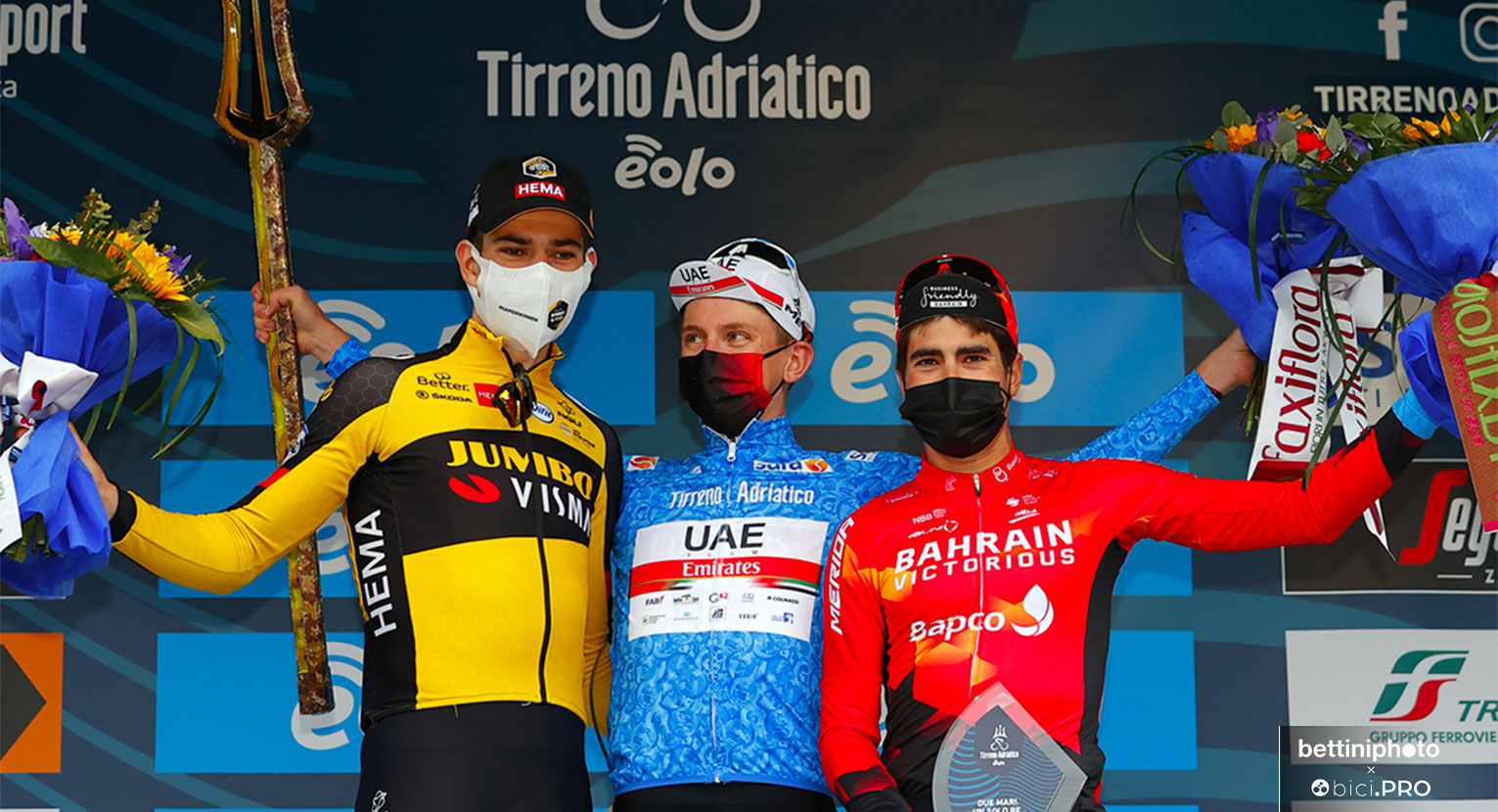 Eravamo tutti pronti a brindare con Filippo Ganna, invece la Tirreno-Adriatico ha mostrato ancora una volta il suo volto più duro. E dopo una settimana che più severa non poteva essere, anche il gigante di Verbania ha dovuto arrendersi alla condizione certamente notevole di Van Aert e alla qualità di Kung, che ha dovuto lavorare certo meno di lui nelle tappe dure. Dopo di loro, sul traguardo di San Benedetto è sfilato Tadej Pogacar, a dimostrare che quella a La Planche des Belles Filles, ancorché in salita, non fu una crono figlia del caso. Il giovane sloveno si porta così a casa la Corsa dei Due Mari, davanti a Van Aert e Landa (foto di apertura), avendo mostrato in almeno tre occasioni freddezza e padronanza da veterano. A Prati di Tivo, dove ha vinto staccando tutti. A Castelfidardo, dove ha ugualmente staccato tutti mancando solo Van der Poel. E nell’ultima crono, dove si è messo ancora alla prova arrivando quarto.