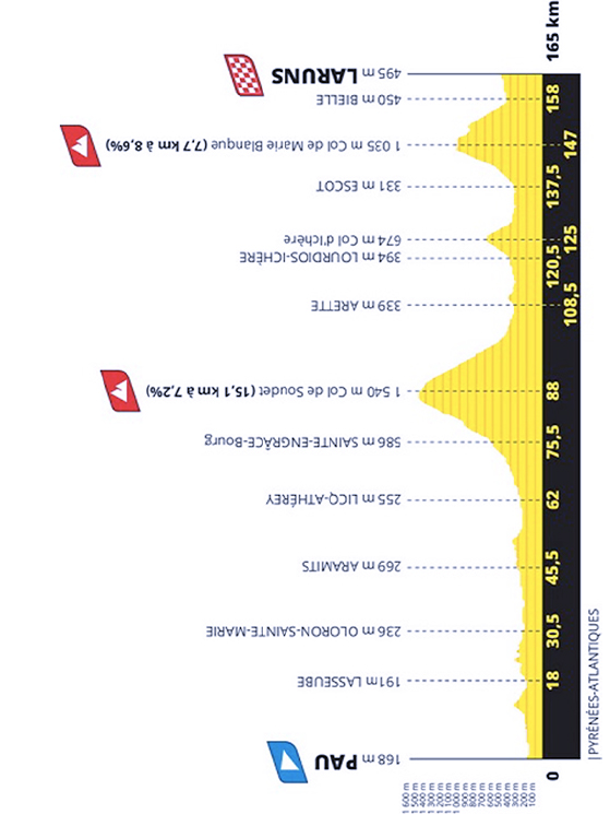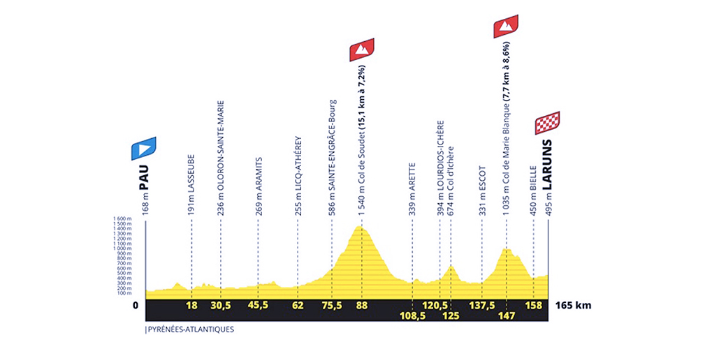 Le vere salite, i Pirenei, arrivano due giorni dopo nella Pau-Lauruns. Nel finale si scala il Marie-Blanque salita non lunga, ma dura e asfissiante per la sua umidità. E il giorno dopo c’è il Tourmalet e la scalata finale a Cauterets, erta lunga ma pedalabile (16 km al 5,4%) tipica del Tour.