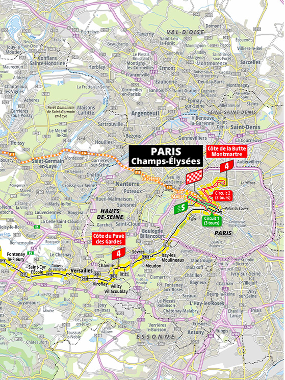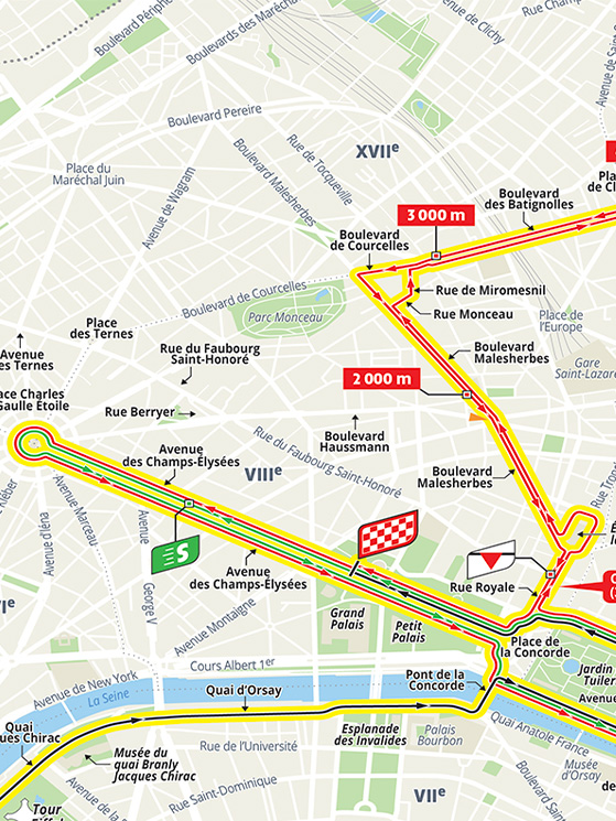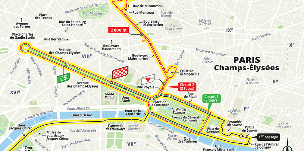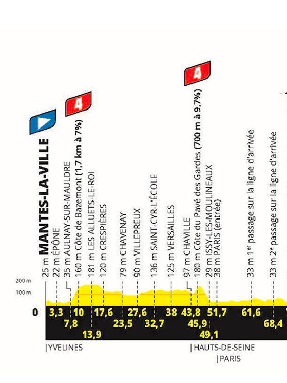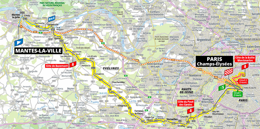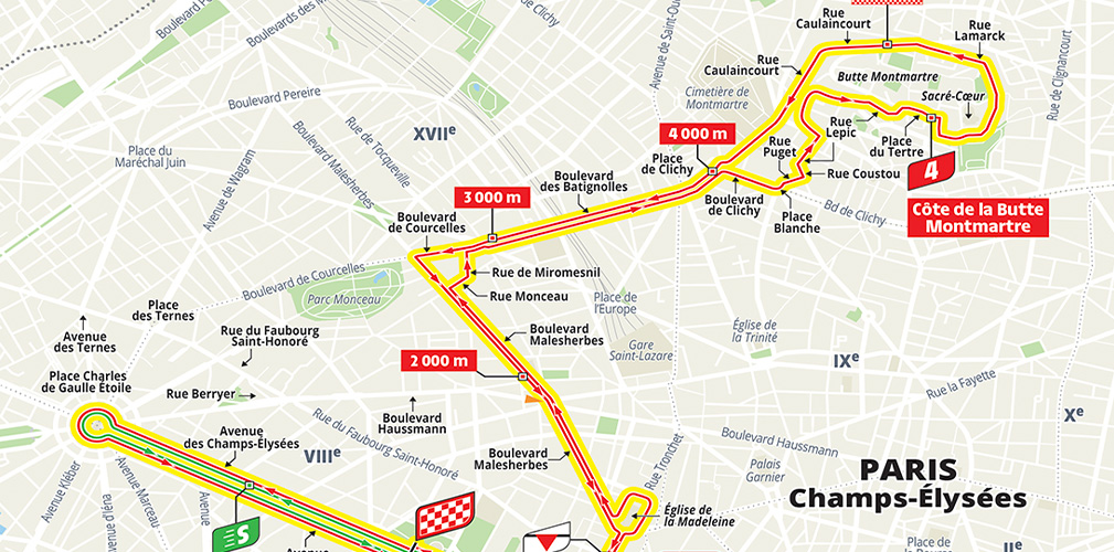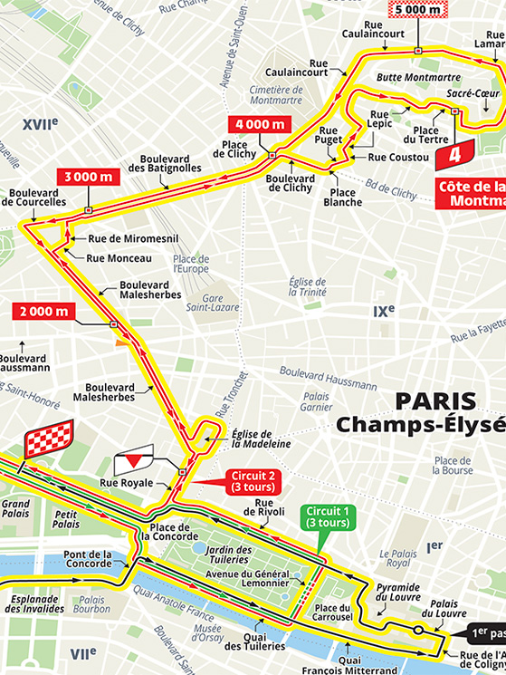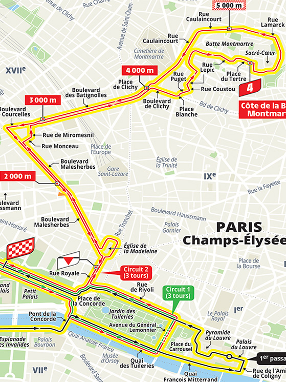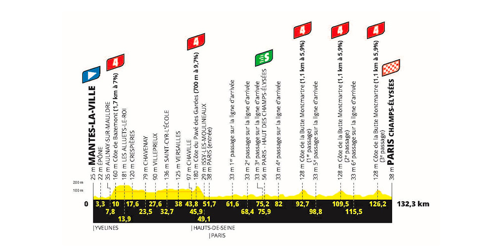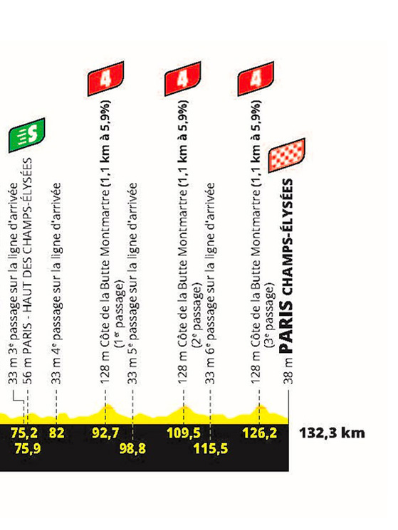 L’ultima tappa non sarà dunque la consueta attesa della volata finale, ma potrebbe addirittura incidere sulla classifica, qualora i distacchi fossero ancora minimi. Il gruppo infatti percorrerà 4 giri del classico circuito degli Champs Elysées. Nel corso del quarto cambierà direzione a Place de la Concorde e punterà verso Rue Lepic (con un attacco leggermente diverso da quello dei Giochi, a causa dei lavori stradali).