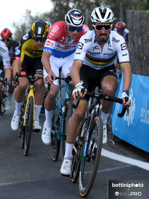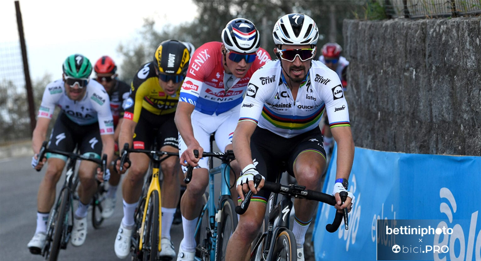 Partiamo dal campione del mondo francese. Nonostante le attese, non si può negare che l’inizio di stagione di Alaphilippe non sia stato all’altezza del suo blasone. Fra i tre tenori, il corridore della Deceuninck-Quick Step è quello che ha corso di più, 16 giorni. Ha ottenuto però una sola vittoria, nella 2ª tappa della Tirreno-Adriatico, insieme a 3 podi fra cui il secondo posto alla Strade Bianche. Eppure, già in quell’occasione, nella sua stizza per la sconfitta di fronte a Mathieu Van Der Poel, c’erano i prodromi di come sarebbe andata nelle settimane successive.