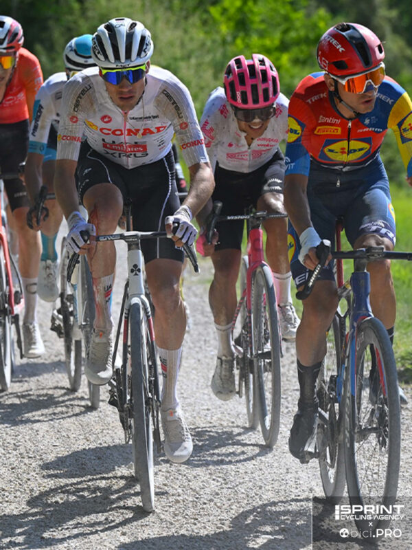 Del Toro ha lo sguardo sbarazzino e il ciuffo che ravvia spesso con la mano destra. Nonostante sia il leader del Giro d’Italia, evita accuratamente di sbilanciarsi. Racconta di aver ricevuto un messaggio da Pogacar sull’aver vinto la tappa di ieri: se puoi farlo – questo il senso – devi farlo.