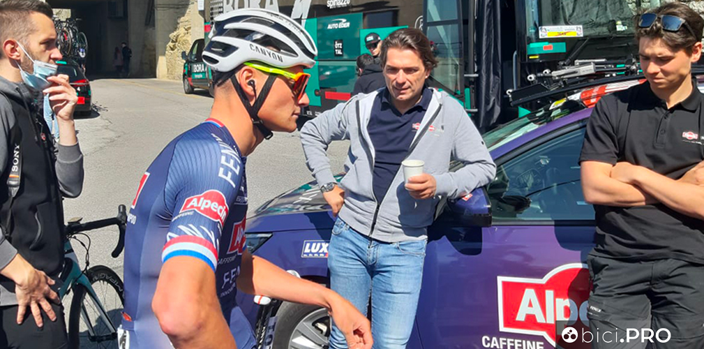 Nel piazzale dei bus, Van der Poel è appoggiato alla sua bici e si gode gli ultimi istanti di tranquillità con alcuni suoi compagni prima di andare verso la partenza della terza tappa, quella disputata tutta attorno a San Marino. Accanto a loro c’è anche Christoph Roodhooft, storico diesse del fuoriclasse olandese, che dà le ultime disposizioni. Avviciniamo proprio il manager belga per scambiare qualche battuta.