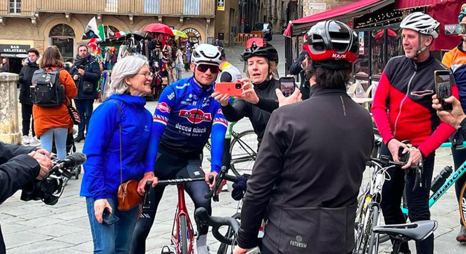 In Piazza del Campo lo hanno accolto e circondato (foto Het Nieuwsblad in apertura). Succede quando il centro di Siena è pieno di cicloturisti del Nord Europa e tu sei quello che la Strade Bianche l’ha dominata due anni fa con una sparata terrificante in faccia a Bernal e Alaphilippe.