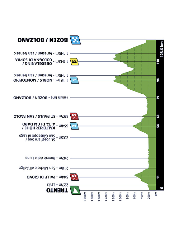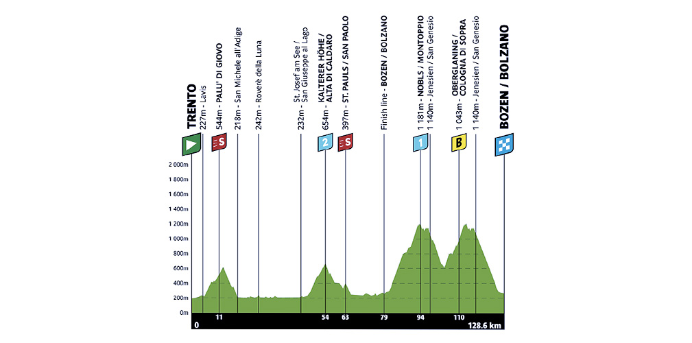 Il finale è difficile e si possono fare differenze. Due volte San Genesio, due salite ravvicinate. La prima scalata parte da molto in basso e potrebbe essere una classica salita da 40 minuti almeno. Poi planata finale su Bolzano, in centro. Sarà uno spettacolo.