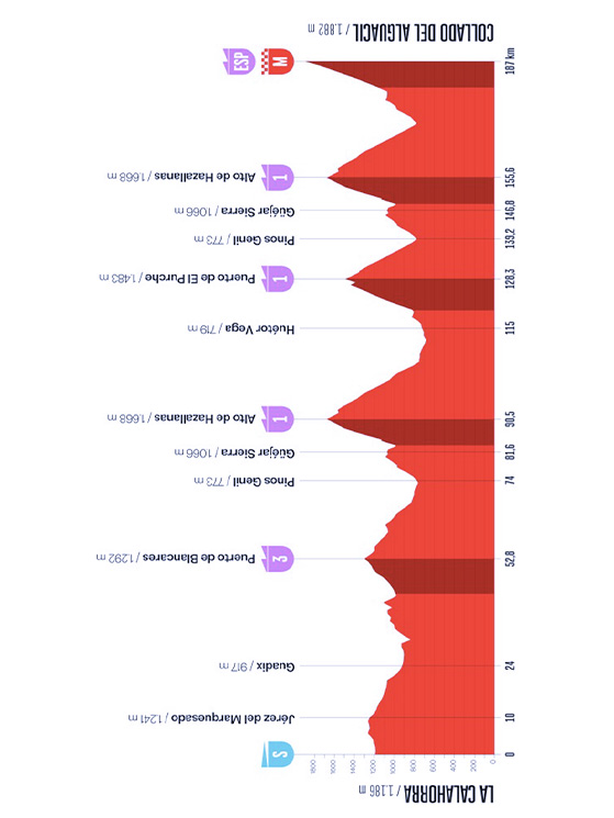 Archiviata la parte F1 e la cronometro, spazio a salite, salite e ancora salite. Penas Blancas Estepona è l’arrivo in quota della frazione 19, mentre Collado del Alguacil è quello della ventesima: 8,3 chilometri al 9,8 per cento di pendenza media. Si tratta di due tappe lunghe, entrambe oltre i 200 chilometri, e molto esigenti prima del finale. In totale sfiorano i 10.000 metri di dislivello complessivi. In particolare quest’ultima salita si annuncia davvero tosta. Sarà un grande spettacolo, anche paesaggistico: siamo infatti nella Sierra Nevada, la regina delle montagne spagnole.