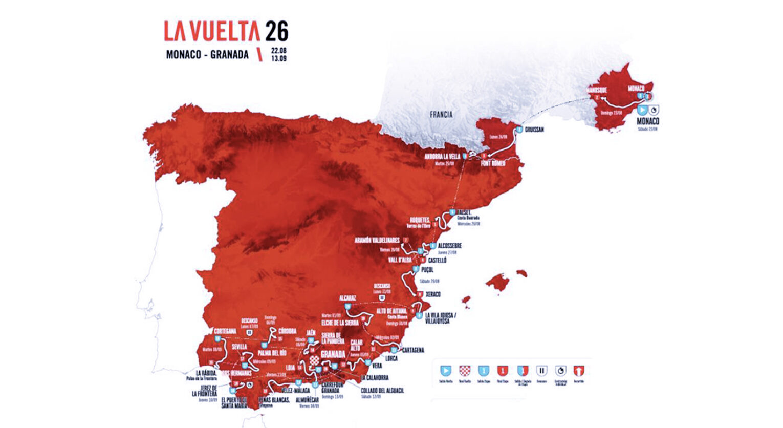 Adesso la lista è completa. Dopo il Tour de France e il Giro d’Italia, anche la Vuelta svela il suo percorso. E a guardare la planimetria dell’81ª edizione sembra quasi di vedere un vecchio Giro del Mediterraneo: tutta vicino alla costa. E a ribadirlo è stato lo stesso patron della corsa roja, Javier Guillen: «Sarà un’edizione molto mediterranea, dall’inizio alla fine. Monaco darà un via prestigioso a un percorso che visiterà città storiche, salite mitiche e passi inediti, prima di concludersi in una cornice unica come l’Alhambra».