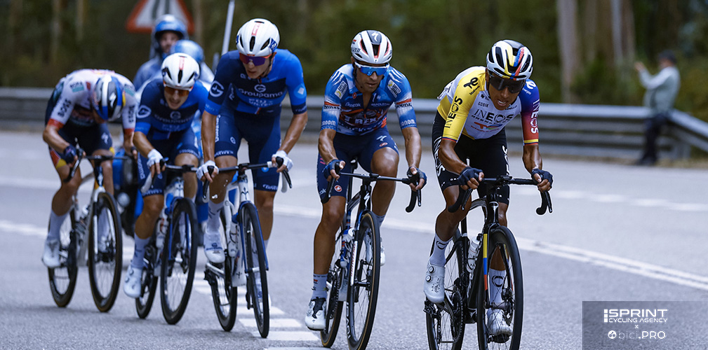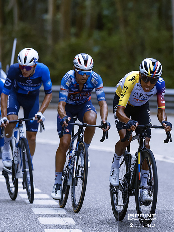 Landa e Bernal restavano in due grazie alla foratura che aveva fermato il terzo fuggitivo, Clement Braz Afonso. I tre avevano fatto la differenza sull’Alto de Prado, una scalata durissima con punte al 18 per cento. Bernal mostrava grande gamba: quando tirava lui, il gruppetto si allungava e anche i colli degli altri fuggitivi. Landa era uno dei pochissimi a resistere, ma con fatica.