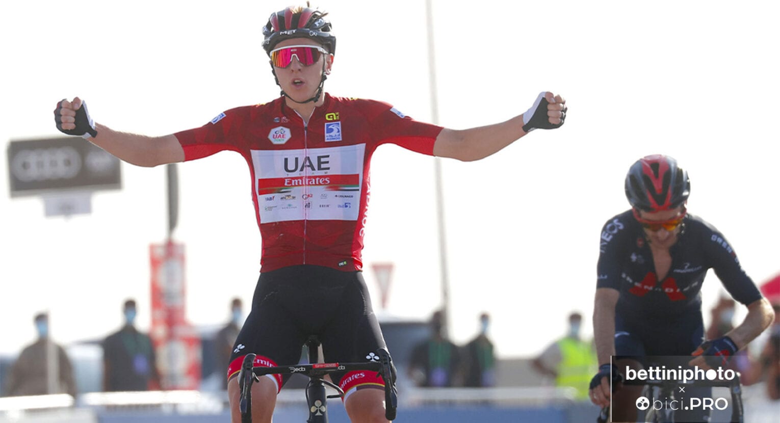Sotto le menate della sua squadra davanti restano in tre: Yates, Pogacar e Kuss. Lo stesso Yates accelera e restano in due: lui e Pogacar. Di “scatti” (con due virgolette grosse così) il portacolori della Ineos ne fa sei in tutto, restando sempre in testa. E così facendo agevola la vittoria di Pogacar.