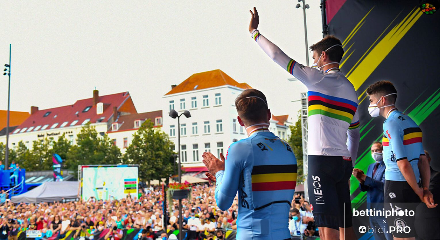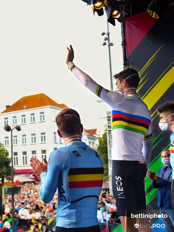 Le sei di un pomeriggio che non dimenticheremo tanto presto. L’apertura dei mondiali di Flanders 2021 parla italiano e lo fa con la potenza del nostro gigante. Ganna ha vinto la maglia iridata della crono con una rimonta strepitosa ai danni di Van Aert. Quasi sette secondi di ritardo al primo intermedio. Meno di un secondo al secondo. Sei secondi di vantaggio sul traguardo. Raramente una sfida a crono ha avuto una tensione così alta, mentre Evenepoel friggeva sulla hot seat, avendo però capito che il suo miglior tempo avesse ormai i minuti contati.