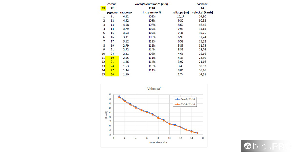 Un grafico che permette di osservare lo sviluppo metrico della combinazione 53-39 e il confronto lineare con il 54-40 In questo grafico il soggetto è il plateau 54-40, confrontato con il 53-39