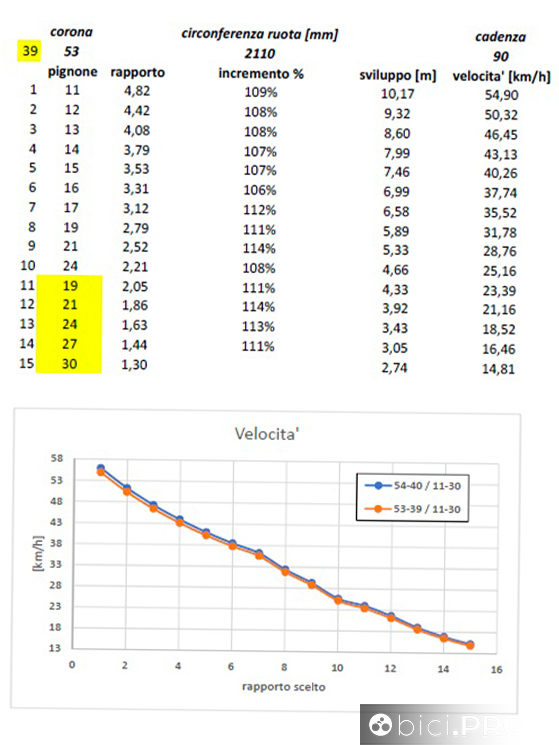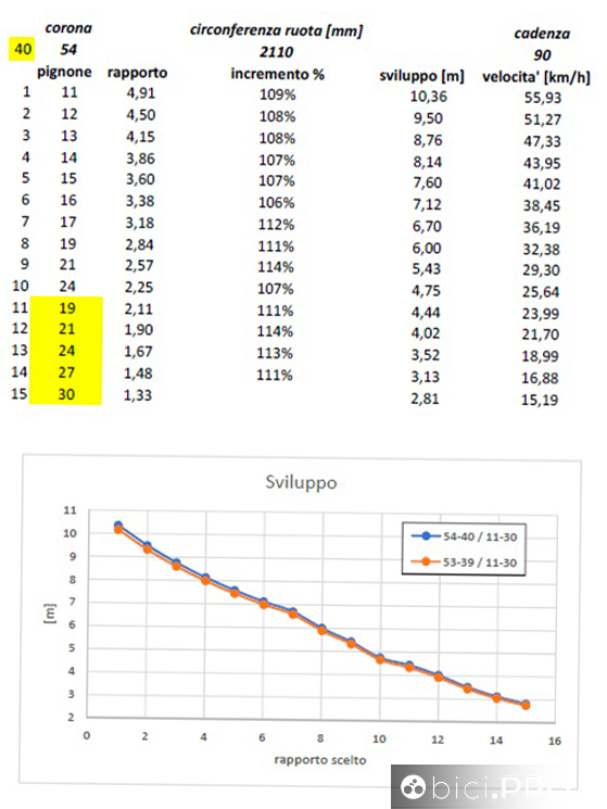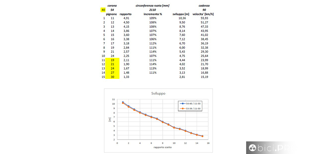 Un grafico che permette di osservare lo sviluppo metrico della combinazione 53/39 e il confronto lineare con il 54-40 In questo grafico il soggetto è il plateau 54/40, confrontato con il 53-39
