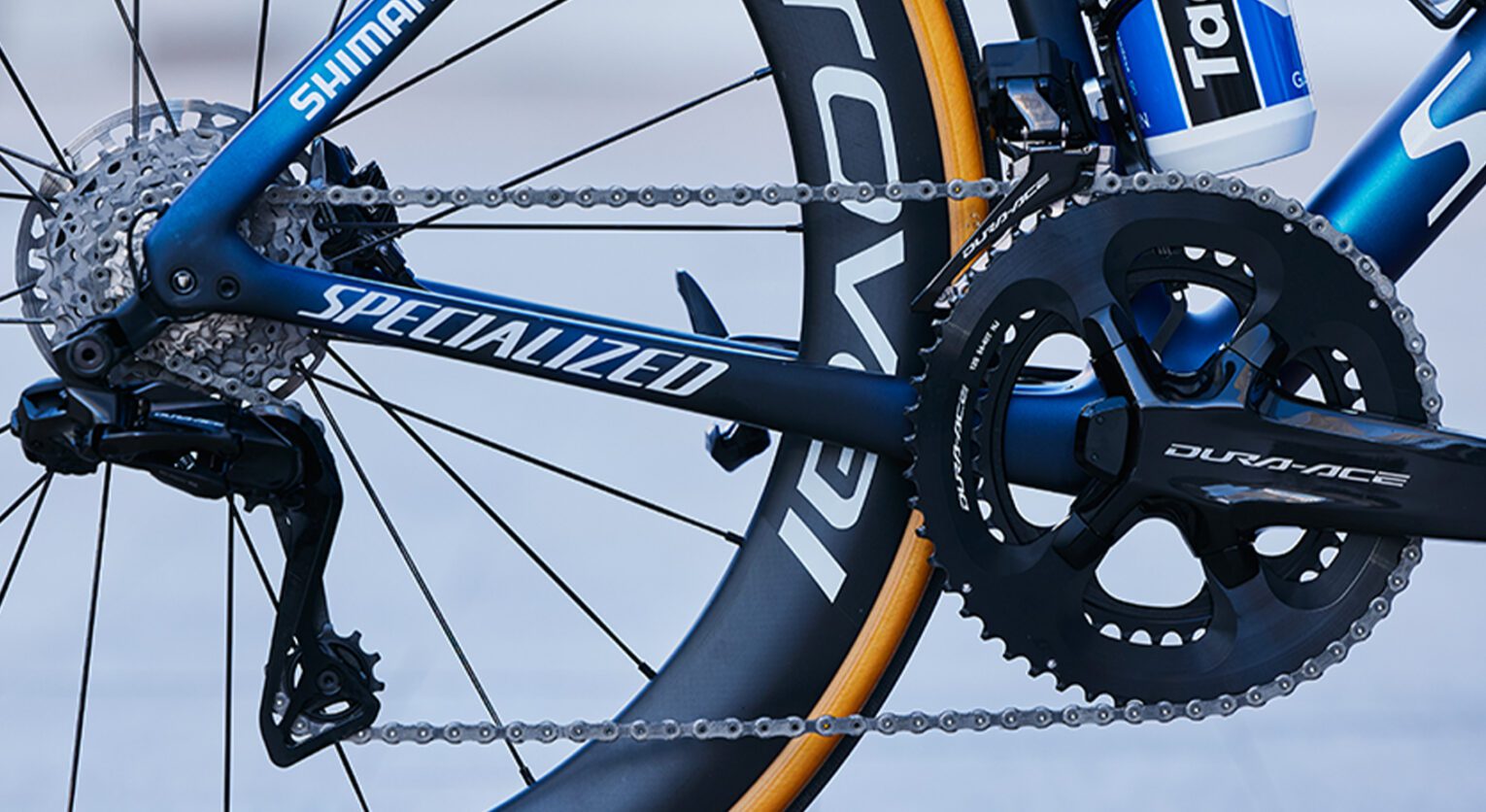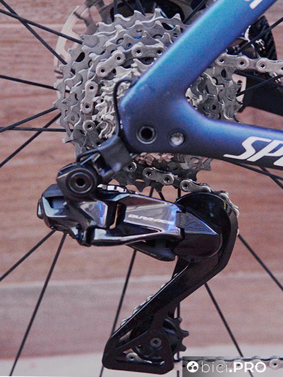 La bici da gara è montata con lo Shimano Dura Ace a 12 rapporti. La combinazione è 54-40 davanti e 11-30 dietro. Uso le pedivelle da 172,5 su tutte le biciclette, quella da allenamento e quelle che porto in competizione. La bicicletta che tengo a casa, quella dedicata solo agli allenamenti è montata con il Dura Ace a 11v. In questo caso la combinazione è 53-39 e 11-30.