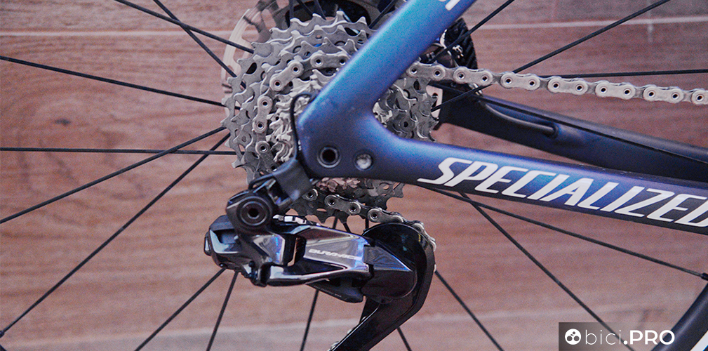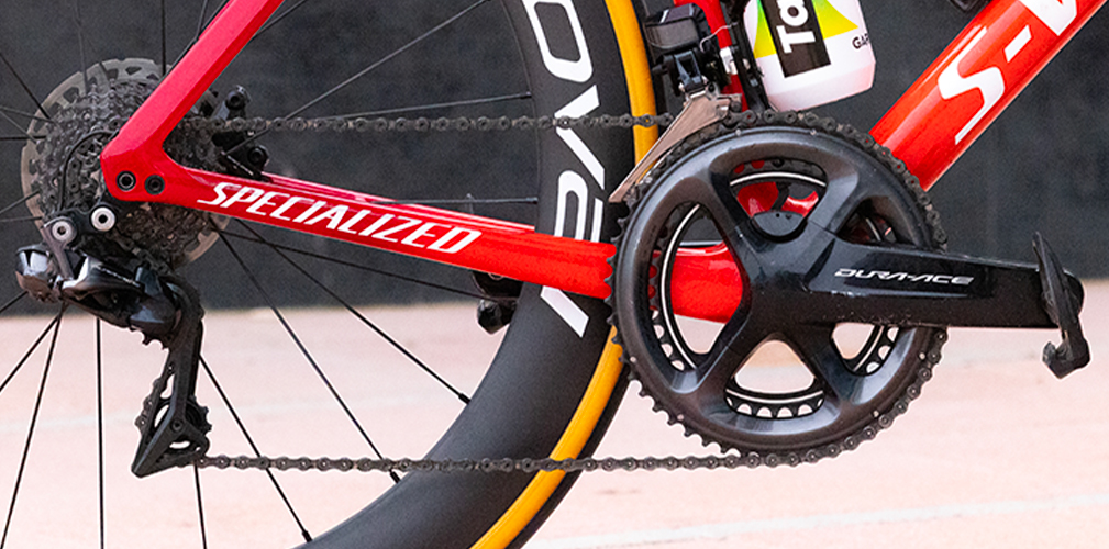 Molte gare si decidono in una frazione di secondo e le velocità, medie e di picchi, sono aumentate in maniera esponenziale. Servono degli sviluppi metrici maggiori, ma anche la possibilità di sfruttare l’efficienza (aumentata rispetto al passato) delle trasmissioni. Il 54 Shimano, con il suo design (guarnitura inclusa) e grazie alla linea catena permette di sfruttare in modo ottimale i pignoni da 12 e 13 denti. Inoltre si genera anche un minore attrito dei componenti quando la catena sale verso l’alto, fattore che trova conferma dalle dichiarazioni di Bagioli.