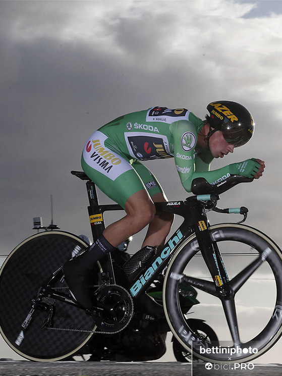 Come detto, per la strada ha usato sempre gli stessi rapporti, così come le pedivelle: 165 millimetri sia su strada che a crono. Mentre sono cambiate le corone tra prima e seconda crono: nella prima aveva il 60-46, nella seconda la monocorona da 62 denti.