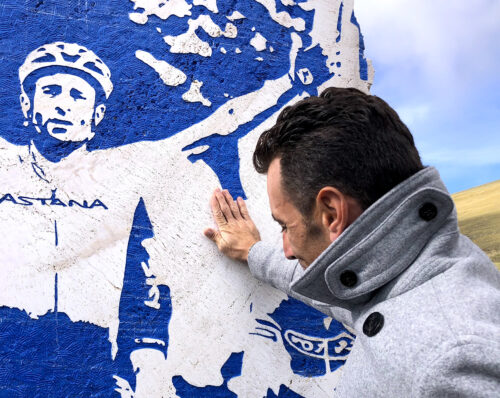 Il legame tra questo paese delle Marche e Scarponi si respira ovunque. Nelle foto che sbucano dalle finestre che danno sul corso, fino al murales realizzato recentemente proprio per il passaggio del Giro. Lo troviamo nel punto maledetto dove 5 anni fa avvenne la tragedia. Al centro dell’opera, realizzata da uno street artist di Osimo, campeggia Frankie, la stupenda ara giallo-blu che accompagnava Michele nei suoi allenamenti. E che ha reso dolci e oramai struggenti i loro video che girano sul web. Anche noi, alzandoci sui pedali, scrutiamo il cielo oltre la visiera del cappellino. Nella speranza che un’ara giallo-blu voglia farci compagnia per un tratto di strada…